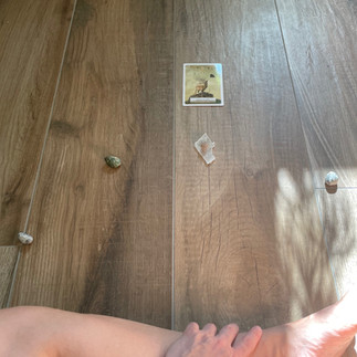 Het volgende veld had even tijd nodig om duidelijk te maken wat het brengen kwam. Waar ik voelde dat het ging om een veld voor aarding, bleef het wat onduidelijk. Zoals vaker als iets zich (nog) niet helder laat zien, dan laat ik het even voor wat het is en vertrouw ik erop dat de energie me op een later tijdstip laat zien wat de bedoeling is. Zo ook gebeurde met dit veld van mosagaat, ruwe septarie, versteend hout en bergkristal puntjes. Een veld voor aarding, dat was me wel duidelijk, maar het was zo'n zacht aardende energie dat hij niet passend voelde voor een grondend veld (dat mag wat steviger zijn). Toen ik later het veld opnieuw legde werd me helder wat de energie van het veld doet, het is een veld om te aarden in de magische wereld. Een wereld vol magie en speelsheid, die tegelijk met onze bekende aardse wereld bestaat en waar we af en toe naartoe mogen gaan. Om te spelen, in flow te zijn, te rusten en een nieuwe stukjes van jezelf te ontdekken. Belangrijk hierbij is om steeds in contact te blijven met je (aardse) lijf. Je hebt het uiteindelijk hier op aarde te doen. Een bijzonder en uitnodigend veld!